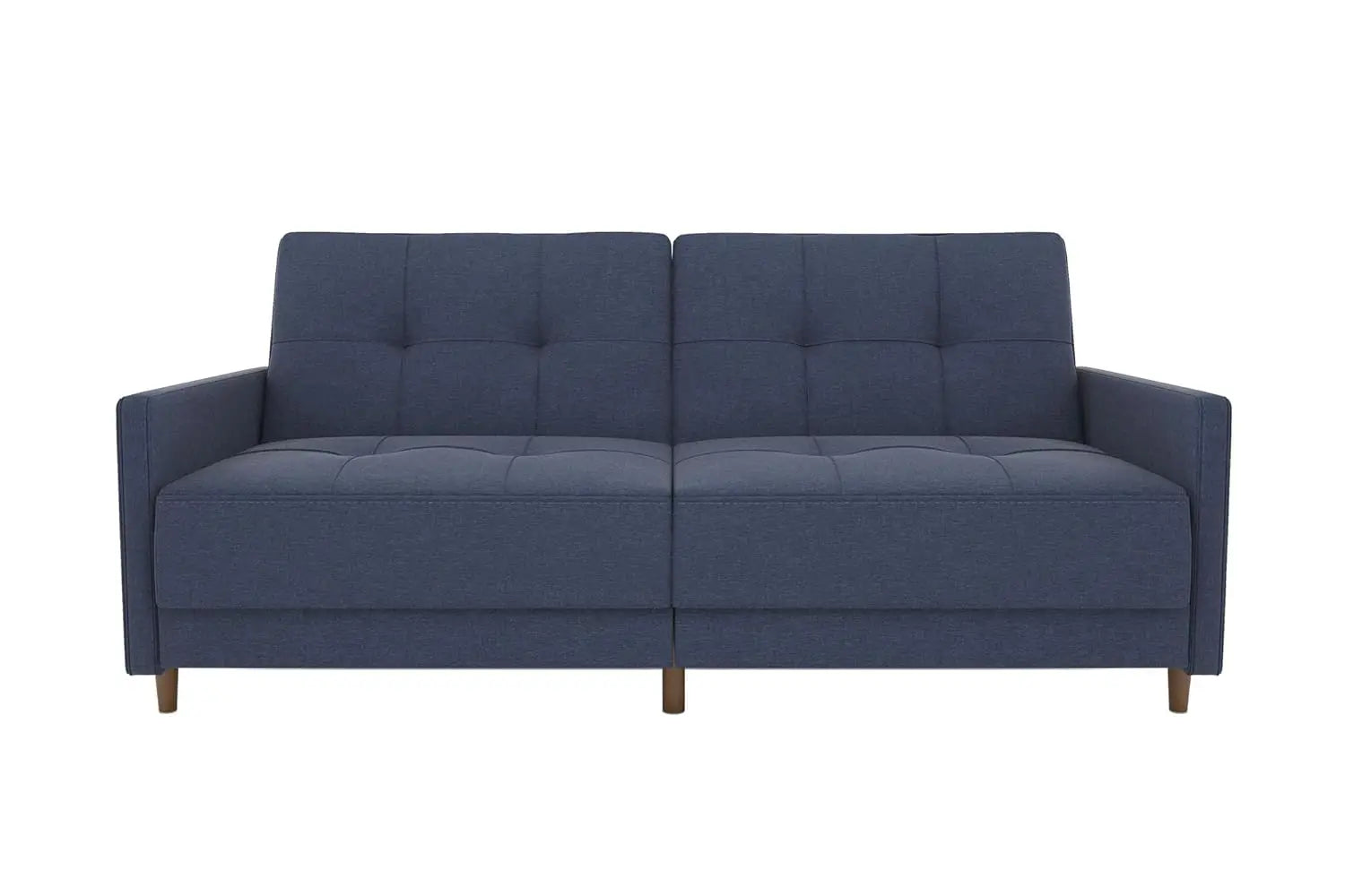 Embracing a timeless style, our classic upholstered futon couch and sleeper features a button tufted seat and back with tapered light brown solid wood legs for refined living room charm