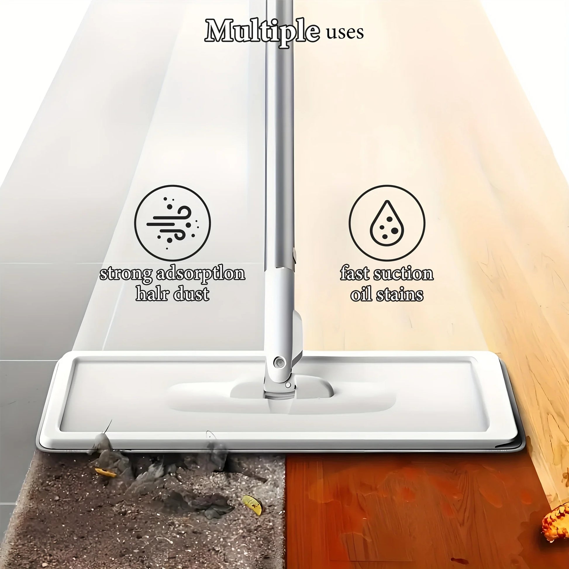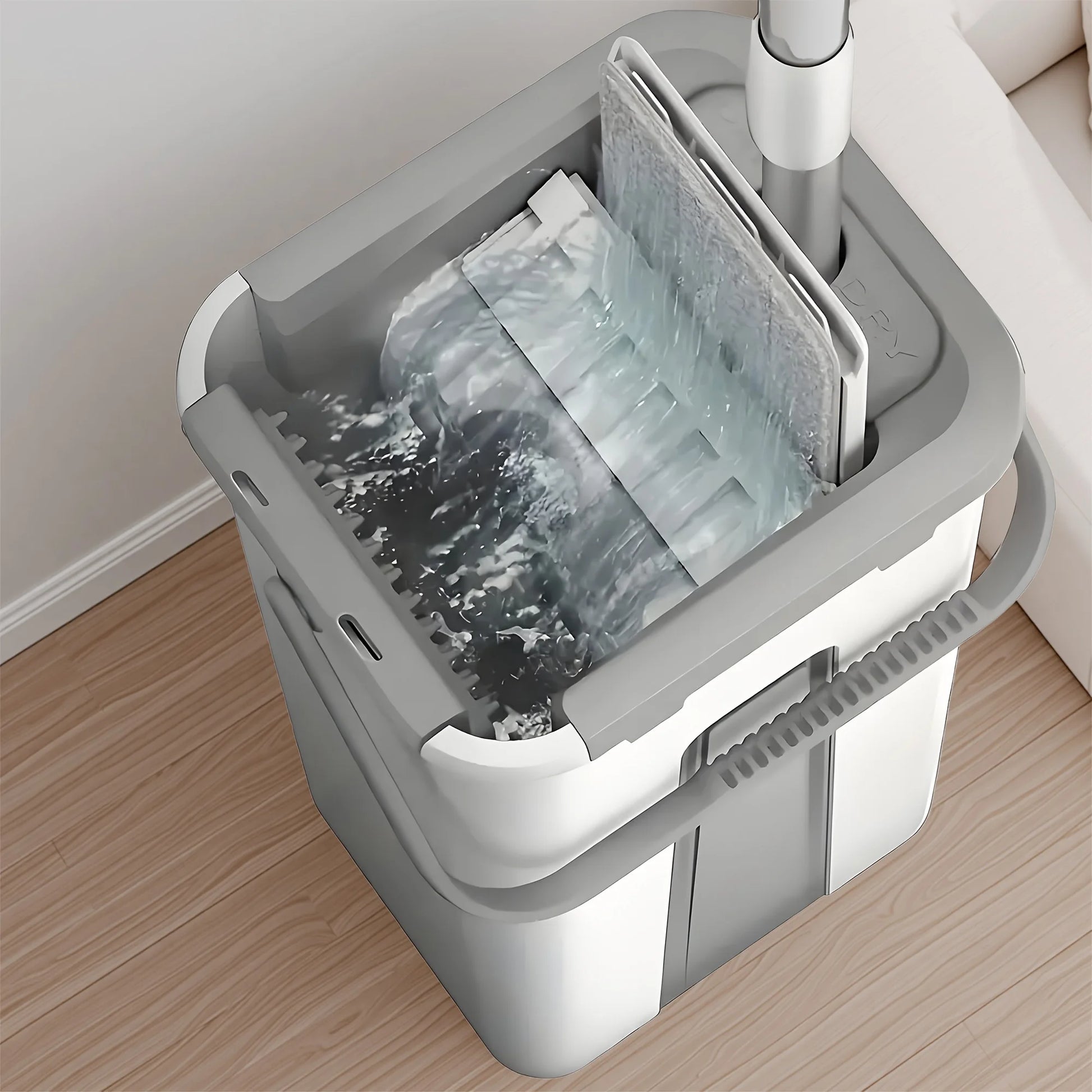 A mop and bucket with a wringer set, featuring a two-bucket system for washing and drying, effectively removing dirt in the wash compartment and wringing out water in the dry compartment, allowing for hands-free cleaning with the mop and bucket.